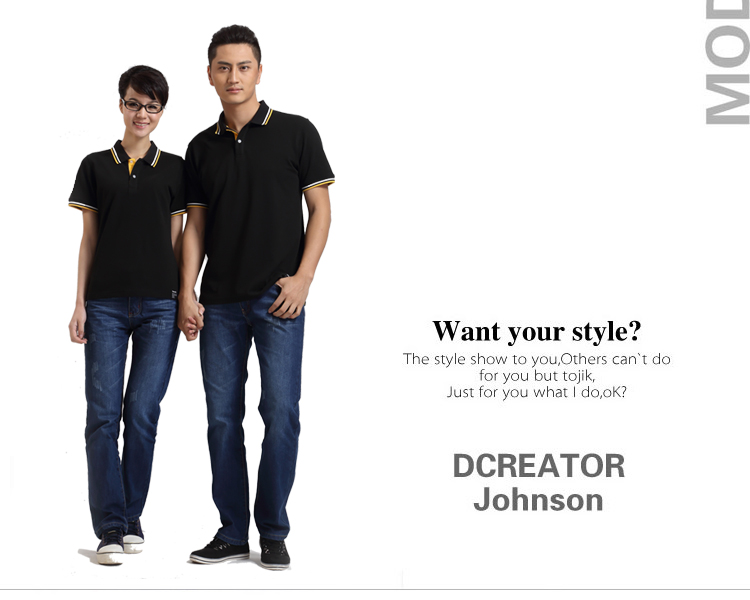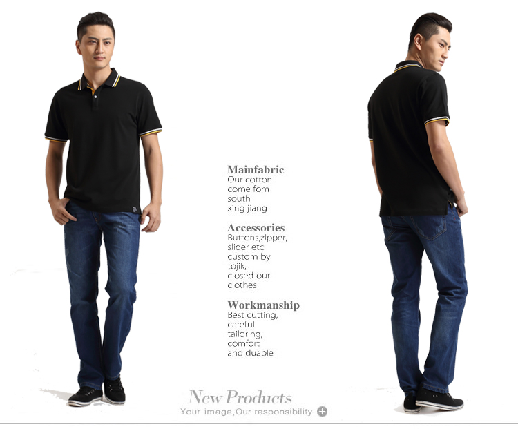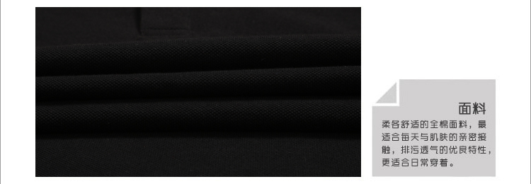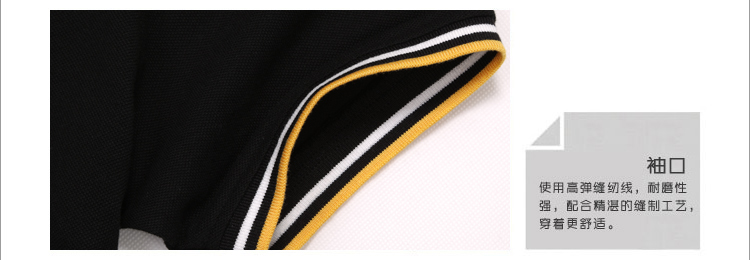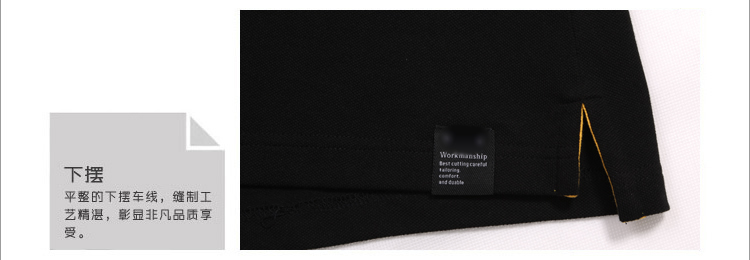 > 黑色珠地純棉t恤衫,領(lǐng)袖間條撞色,門襟撞色款式制作